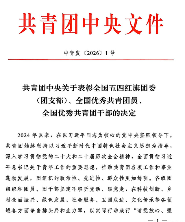 近日,共青团中央发布《关于表彰全国五四红旗团委(团支部)、全国优秀共青团员、全国优秀共青团干部的决定...