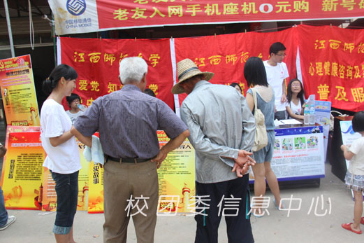 陆陆续续地,展台前零星地来了好几位老人,党史宣讲服务队的队员们便热情地为老人讲解有关党的历史及故事。老人们十分开心能够得到同学们如此细心地讲解,认为青年大学生在“三下乡”社会活动中如此积极地宣传党史和革命传统,十分有意义。其中有一位高龄老人王应朸,他今年已经82岁了,24岁时入党,至今已有58年党龄。他开心地告诉队员说,他年轻的时候曾当过村里的村干部,在那个动荡不安的年代,能吃饱,能睡好就曾是最大的追求。然而今日在共产党的带领下日子越过越好了,如今他的孩子们也已有很大出息。他讲,在以前这都是很困难的。老人说话的声音并不是十分清楚,然而他对党的深情流露在质朴的言语中,那深情中跳跃着的喜悦和幸福,却是谁都可以看见的。