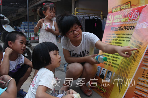 今年是中国共产党成立九十周年,为了这份重大、特殊的纪念,江西师范大学从历史文化与旅游学院精心挑选了一批优秀的学生,组成了校总队党史知识宣讲小分队。为了在当地做好党史宣讲,队员们花费了不少功夫。在此次社会实践地确定为抚州南城之后,队员们立即着手,查阅大量当地有关历史等,希望能够使所讲内容更为贴近当地百姓;同时围绕“党建立的过程,党名称的由来,党的宗旨,党史故事”等内容制作了不少宣传展板,从而激起居民们关注的兴趣,更为全面地开展党史宣传。