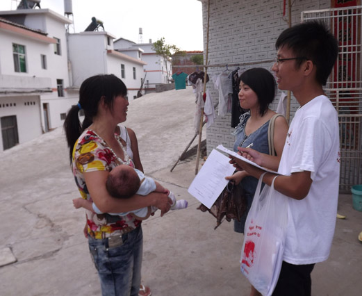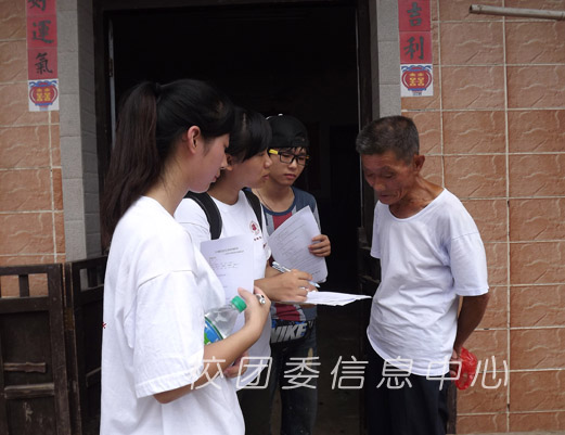 分队小组各自行动,来到殿下新村等村庄向村民们发放问卷。大多数居民都比较配合队员们的工作。但是语言的障碍导致的沟通不畅,是横越在调研队员和村民之间的最大问题。很多村民乡音浓重,队员们听不懂,只好请来当地小朋友来“翻译”。一些老人们没有接受过教育,不能理解和填写问卷,队员们就通过一对一问卷解说,由老人们口述回答,队员们帮助填写。通过努力,队员们终于克服了困难,将调研继续进行下去。