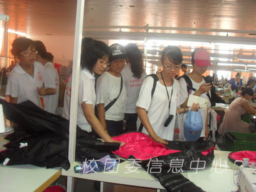 “鸭鸭”羽绒服企业与共青城同步成长,是有“中国创业基地”美誉的共青城龙头企业之一。实践队员首先向“鸭鸭”企业高层管理人员了解了其基本概况,包括企业结构、人力资源、管理模式和创业模式等。随后,他们深入基层,来到“鸭鸭”生产流水线调查具体情况。队员们仔细地观察工人们的缝纫过程,与各车间人员交流,询问他们的工作流程与分工。