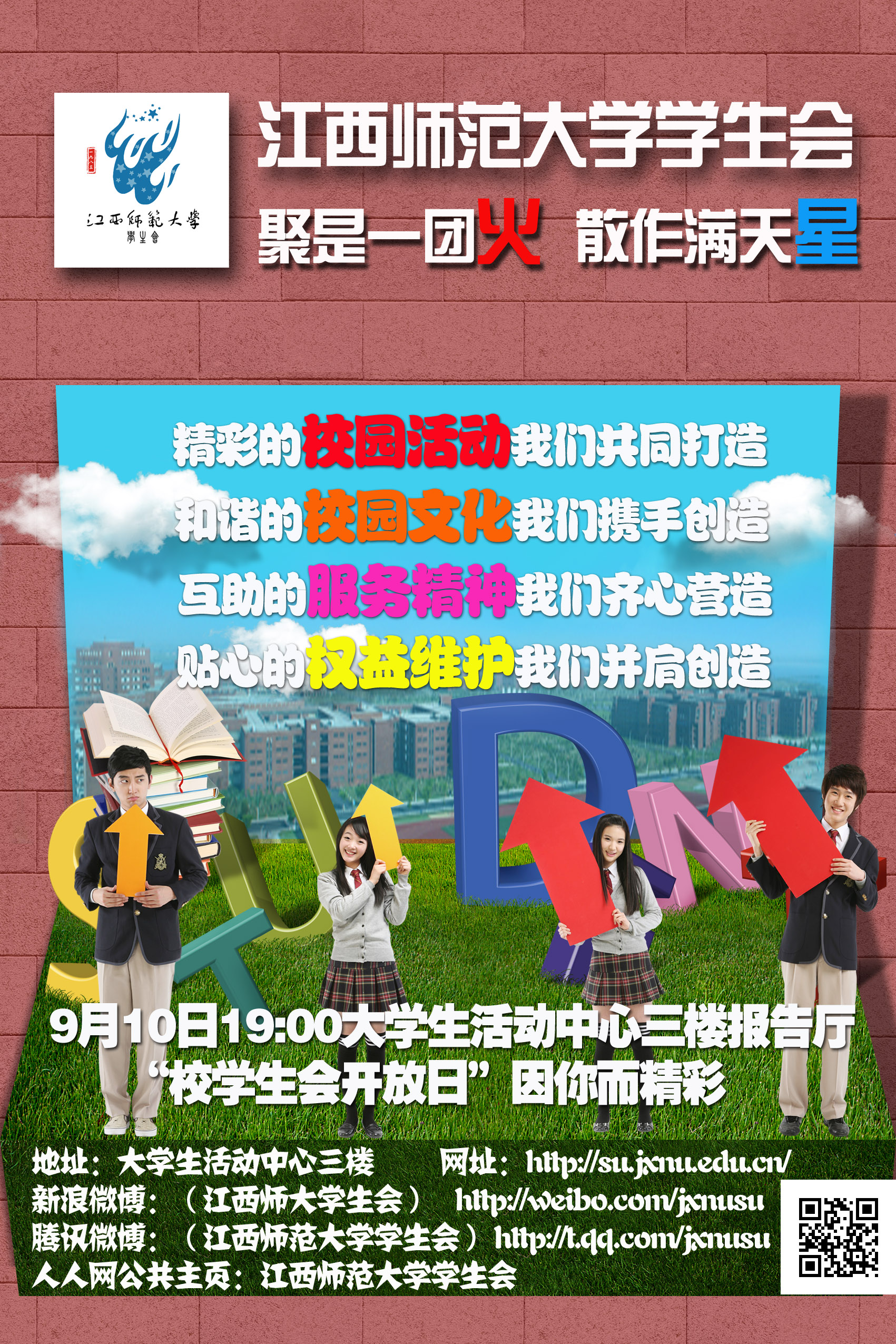 即可报名。为方便各位新生更全面更直观的了解校学生会,9月10日晚19:00“校学生会开放日”将在大学生活动中心三楼报告厅精彩亮相。这个迎新季,有你更精彩,期待你的加入哦!