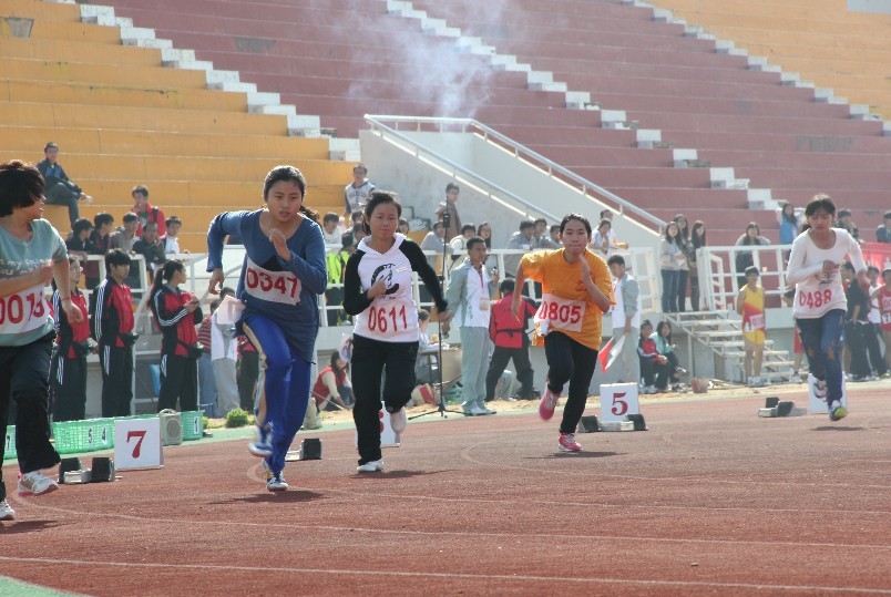 女子甲组200米预赛第二组共有8位选手,其中,传播学院的杨敏排在第六跑道。运动员进入场馆,起跑线上,各位选手在原地蹦跳着,做赛前准备。随着号令员的一声“预备”,第二组的运动员便迅速做好预备动作,蓄势待发。一声枪响,大家不约而同地飞速冲了出去。激烈紧张的比赛在超越和反超中不断进行着。赛场上的加油声连续不断,此起彼伏,充满了激烈的比赛气氛。进入弯道时,杨敏稍微落后,她加快了自己的步伐,朝着终点竭力追赶,不言放弃。她坚定的脚步声,如一个个雀跃的音符,在五线谱般的跑道上踏出了一支欢快的乐曲。