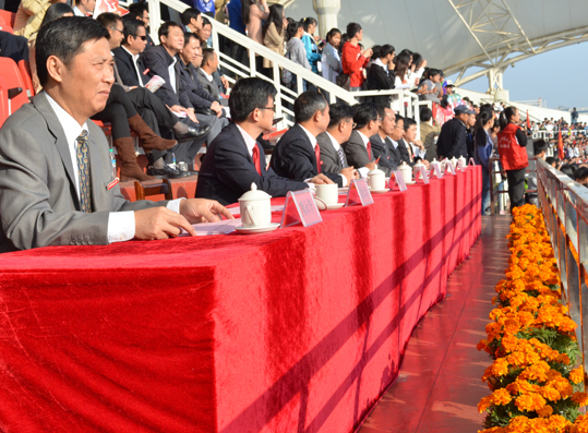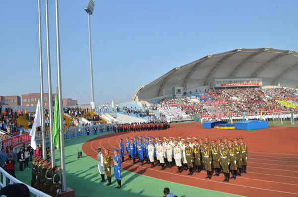 随后,国旗护卫队和军乐团迈着的铿锵有力步伐入场。在国旗、师大校旗及运动会会旗冉冉升起之后,梅国平校长热情洋溢地致了开幕辞,他指出当前是我校发展的关键时期,学校也在不久前迈入了“省部共建”高校行列,他希望广大学子能够继续传承师大精神,在运动赛场上赛出风格、赛出水平。与此同时,他充分肯定了各学院积极备战校运会的态度并预祝本届校运会取得圆满成功。张文涛老师代表全体裁判员宣誓,表明了广大裁判员公证监督、严格执法的决心。体育学院焦伟民同学代表全体运动员宣誓。