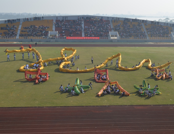 紧接着进行的是各学院的广播操比赛。整齐的队列中,各院以规范标准的动作和整齐的身姿成为赛场上最令人瞩目的焦点所在。作为历届运动会的传统节目,曾多次在海内外参加演出的舞龙舞狮队率先带来气势磅礴的表演。几条色彩斑斓威武雄壮的彩龙在演员手中上下翻腾,腾云驾雾,期间还以龙身摆出“中共十八大”的造型,赢得现场阵阵掌声。英姿飒爽的女子军乐团行进表演也使现场观众大饱眼福,激情的乐声感染了在场的每一个人。曾荣获全国第三届大学生艺术展演专业组一等奖,以当下大学生就业为背景、加入滑稽元素创作的舞蹈《朝气蓬勃》则将开幕式汇演推向了高潮。而轻松愉快的全民运动大展演则让整个体育场变成了一片欢乐的海洋。