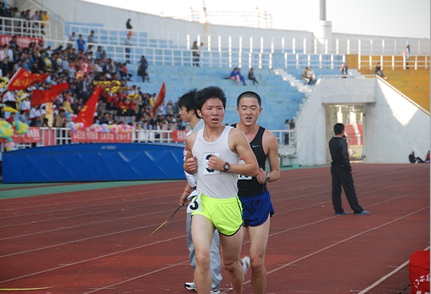 比赛开始冯世骏同学一直跑在第5.6名的位置,为后来的冲刺储存体力。比赛过程中,他一直保持着自己的速度,并慢慢地超越一个个对手,步伐矫健、轻快,神态轻松自然。现场气氛热烈,各院旗迎风招展,啦啦对员们用火热的舞蹈为选手们鼓劲,加油的声音此起彼伏。最后他全力冲过终点线,获得第二名的优异成绩。