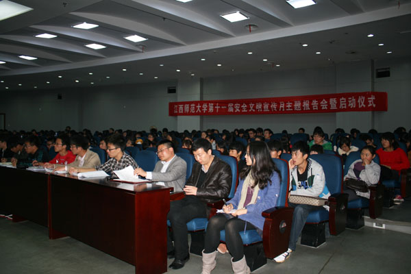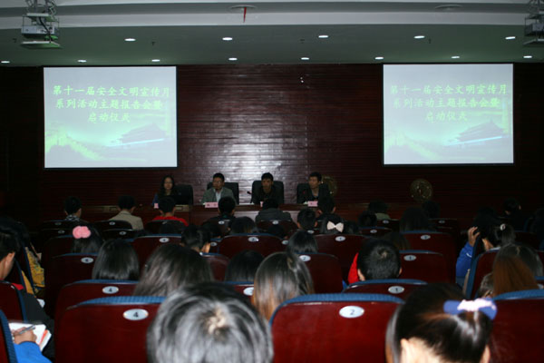 报告会伊始,校团委副书记陈军致开幕词,他介绍了本届安全文明月的主题——“师生欢庆十八大,安全文明你我他”,并就当代大学生特点对校园安全文明进行了详细分析,向同学们传达了安全的理念。随后,