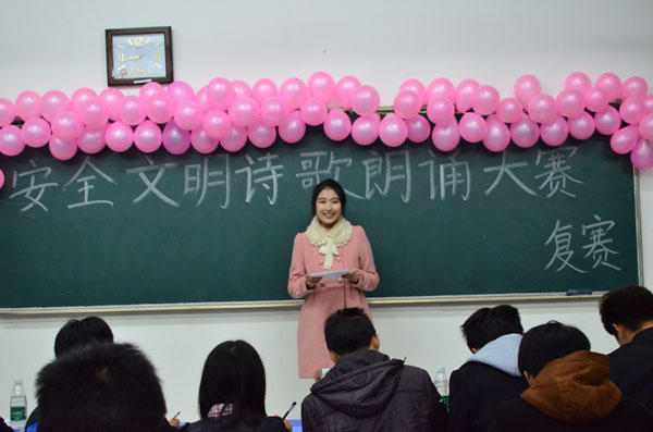 为进一步强化师大学子安全文明意识,丰富校园文化,构建和谐师大,同时欢庆党的十八大召开,庆祝我校成为省部共建高校,11月16日晚7点,由校学生会主办,生命学院、商学院、理电学院学生分会承办的第十一届“安全文明宣传月”之诗歌朗诵比赛复赛在惟义楼2403、2405教室顺利举行。来自各学院的45名选手参加了此次比赛。