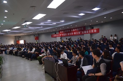 “少年富则国富,少年强则国强,少年独立则国独立”,青少年是国家发展的主力军。为引导我校青年学生成长成才、接过实现“中国梦”的接力棒,5月7日下午,校团委在瑶湖校区图文信息中心6203报告厅举办了一场别开生面的以“传承五四精神、实现中国梦想”为主题的示范性主题团日活动,活动以青年论坛的形式展开。校党委委员、副校长赵明,全国政协委员、我校正大研究院院长兼文化研究所所长王东林,团省委宣传部部长刘小玲,江西卫视“金牌调解员”胡剑云老师,江西师大优秀校友、南昌圈圈网总经理周乐,江西师大优秀校友、南昌市超梦实业发展有限公司董事长、海尔集团全国总会长陈映泉等受邀做客论坛,在现场与我校400余名大学生一同聆听梦想、解析梦想、引导梦想。团委、学生处等部门的主要负责人以及全校专职团干出席了活动。