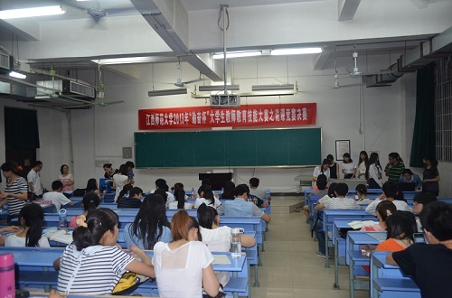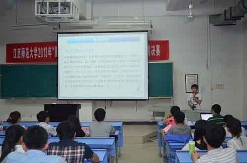 各位选手或是利用幻灯片课件侃侃而谈,或是使用传统的板书方式阐述其授课理念,充分展现了师范类高校大学生优秀的教师教育技能。文学院10级汉语言文学专业的蔡同学从“美丽的错误”入手,层层剖析自己的授课过程,完整地向各位评委及现场观众展示了她对戴望舒先生的诗歌《错误》的精彩说课,赢得了评委和观众的阵阵掌声。而各位评委从“说教材”,“说教程序”,“说课语言”,“说课板书设计”四个方面对各位选手进行现场评分,最终决出一、二、三名。赛后,大赛的负责人校学生会主席团主席曹光景同学告诉大家,此次决赛的结果将在校学生会新浪官方微博上公布。