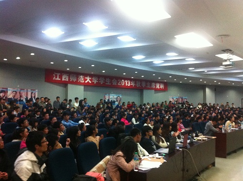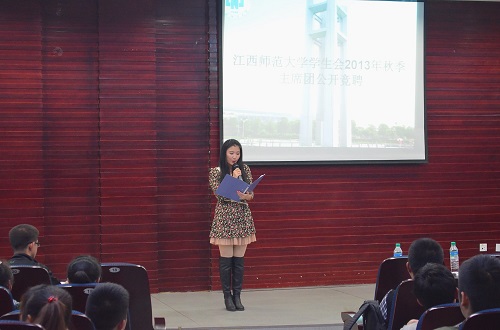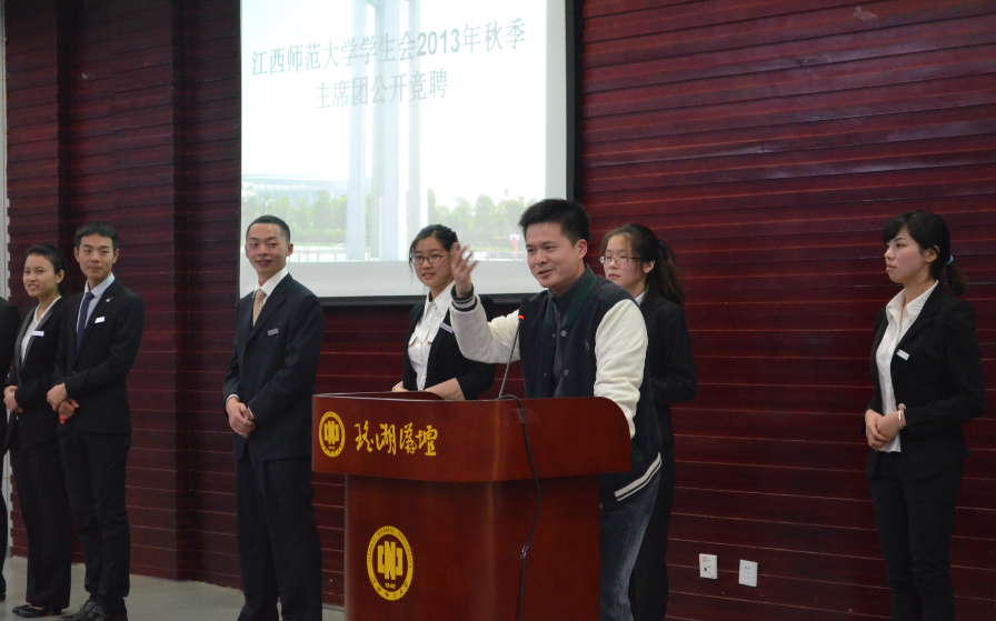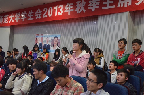 在3分钟的结构化面试环节中,辩题以十八届三中全会的改革热点为背景,综合考察了竞聘者对学生会工作改革以及学生会的活动组织、服务工作、思想引领等方面的看法。竞聘者各抒己见,表达了自己在“思想引领”这一方面做好做强的决心。而“改革”问题中,选手们则在“转变工作作风”、“改善硬件设施”、“加强对外联系”、“完善工作管理机制”等方面提出了自己的建议,并表达了奉献自己,参与校学生会改革工作的强烈愿望。而在5分钟的公开演讲环节中,竞聘者结合自身工作经验,展开了慷慨激昂的演说。有的畅谈自身丰富的学生工作经验;有的充分展示自己在某方面的特长;有的诙谐幽默,给人以深刻印象;有的语言犀利,令人肃然起敬。竞聘者无不展现了师大学子德才兼备、积极向上、敢于超越的良好风貌。虽然一些竞聘者略有紧张,但台下的评审和观众依然用热情的掌声和包容的态度鼓励场上的同学。竞选者们的精彩演讲和出色的表现不时赢得观众热烈的掌声。在最后的现场答辩过程中,11位竞聘者同台亮相,解答了同学们提出的各种疑问,同学们积极活跃,现场反应热烈。而校学生会执行主席许琦作为专业评委提问说到:“11位竞聘者既是竞争对手,又是合作伙伴,如果要求你们选择一位对手合作完成工作,你会选择谁,并谈谈为什么。”其中一些选手风趣幽默,机智应答,掀起竞聘现场的又一轮高潮。