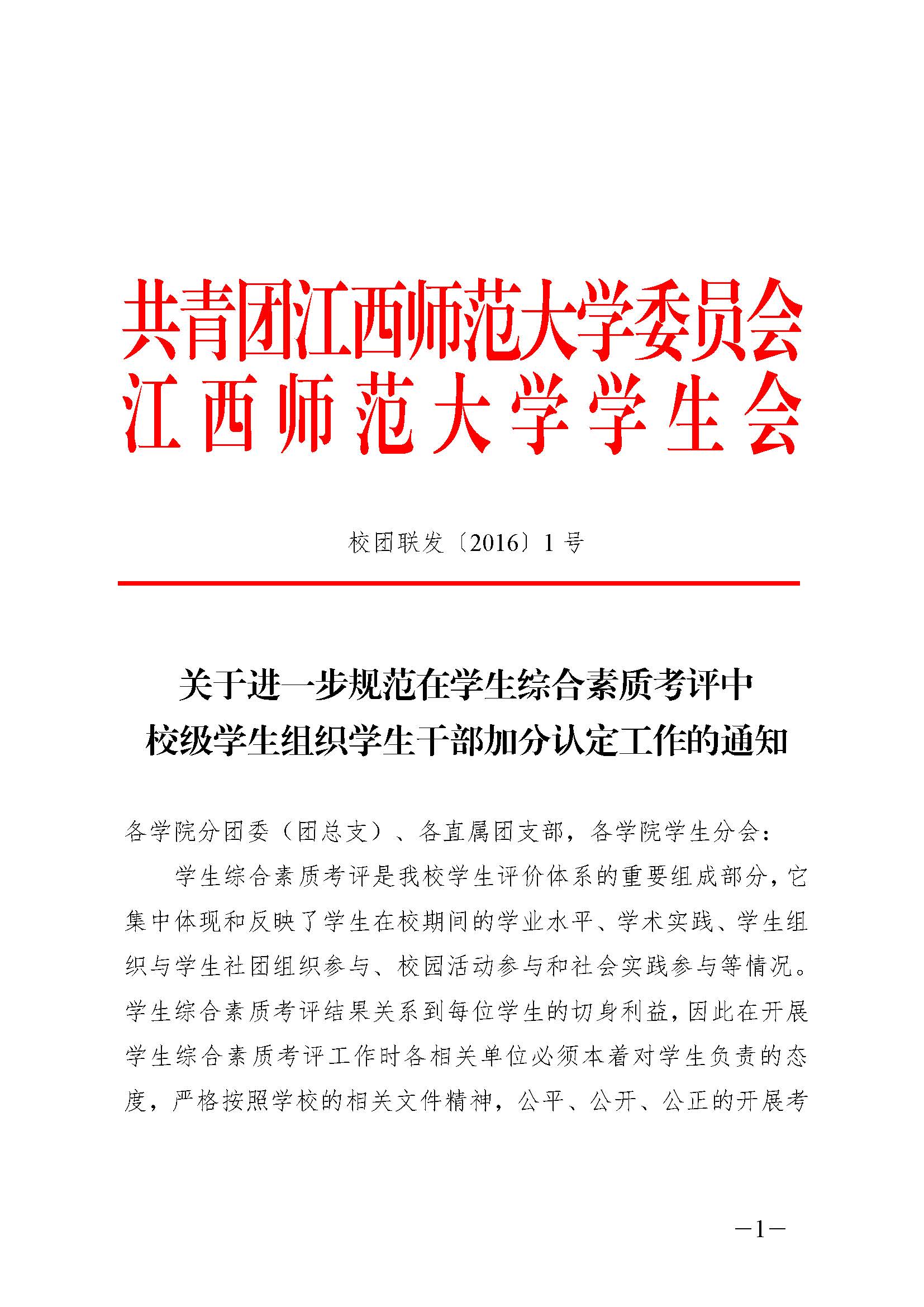 校团联发〔2016〕1号《关于进一步规范在学生综合素质考评中校级学生组织学生干部加分认定工作的通知》