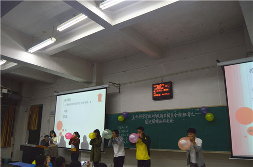 比赛分为必答题、抢答题、风险题三个环节进行,主持人简短地介绍规则后比赛正式开始,选手们聚精会神,认真回答每一道题目,班里同学们也不时为其加油。抢答题环节将现场气氛推向高潮,选手们拼尽全力想抢先吹爆气球为队伍赢得答题机会,同学们也不断为自己班级队伍呐喊、鼓掌。现场气氛高涨,火药味十足,生科一班与生科二班比分一直僵持着,不分上下,其他班级队伍也不甘落后,紧随其后。同学们热情高涨,掌声、欢呼声不断。