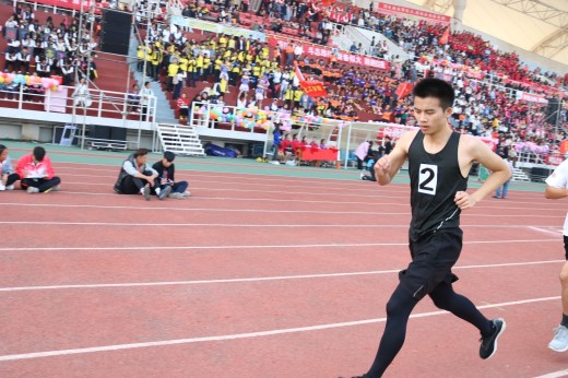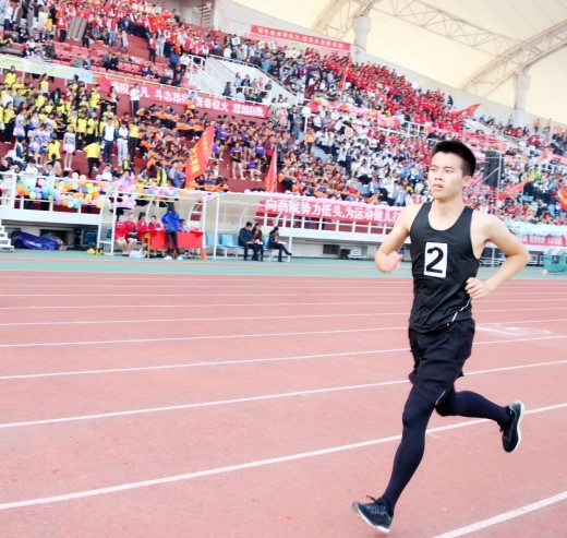 长跑赛道漫漫,比拼的是选手的意志力。本院运动员齐建亮同学愿一个人承受煎熬,向终点进发。起跑令一响,二十一位运动员都并未将速度提到最快,而是都采取了中等速度,有策略地规划好了整个路线。观众们起初心情平静,十分了解长跑局面。不久之后,齐建亮同学开始提速,然后局面忽变,你追我赶,甚是激烈。一段时间后赛事进行到了白热化阶段,这也是最考验选手们意志力的时候,这段时间里,齐建亮同学一直稳稳地保持着他的速度,汗水随脸颊滑落。虽然生理的极限正在牢牢地限制着他,但是他仍缓缓加速,用力甩开手臂,似乎想抽尽自己身体里的所有力量来完成这次比赛,他咬牙坚持着,丝毫不肯放慢速度,他不断调整着状态,呼吸也变得越来越均匀。齐建亮同学挥汗如雨的样子,在这骄阳之下,真是异常潇洒。最终,他以第四名的成绩结束了这场比赛。他竭尽全力了,该院同学们都站了起来为他鼓掌,他点头以示感谢。