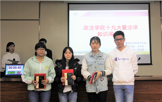 为深入学习和贯彻落实党的十九大精神,增强同学的法治观念和法律意识。11月28日下午,政法学院学生会法学社和学习部在名达楼3301会议室联合举办“十九大知识暨法律知识知识闯关赛”活动。政法学院学生会执行主席董祺、学生会分管主席王博和学习部部长陈斌作为特邀嘉宾参加此次活动,50余名选手参与此次比赛。