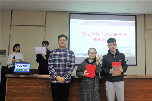 经过一个半小时紧张且激烈的比拼,比赛进入尾声。嘉宾对选手们的突出表现予以肯定,并希望在以后的学习中也能继续努力。通过统分计算,付颖荣获桂冠,胡双和李紫繁获得二等奖,田淼、陈雅雯和秦裕梅获得三等奖。最后嘉宾为获奖选手颁奖合影留念,比赛圆满结束。赛后,参赛选手表示:“不参加比赛都不知道原来我们国家召开的十九大有这么丰富的内容,以后一定会更加关注国家大事和法律知识。”