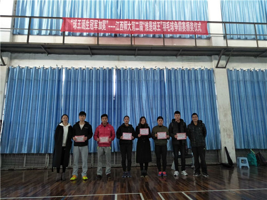 12月9日上午,由体育学院团委学生会主办、江西师大羽毛球俱乐部协办的第二届“谁是球王”羽毛球争霸赛颁奖典礼于长胜体育场羽毛球馆举行,此次典礼由羽毛球专修队陈婷主持,并有幸邀请到体育学院团委负责人徐安、羽毛球专修队教练邓朝晖作为颁奖嘉宾。
