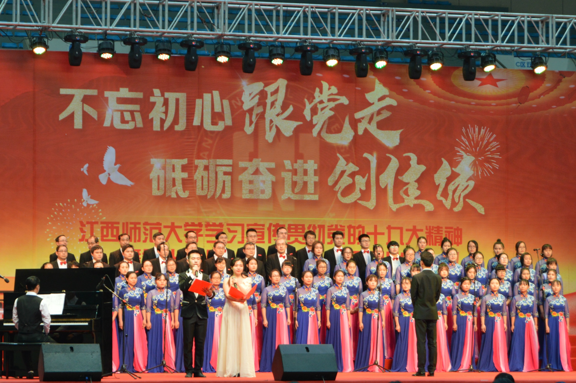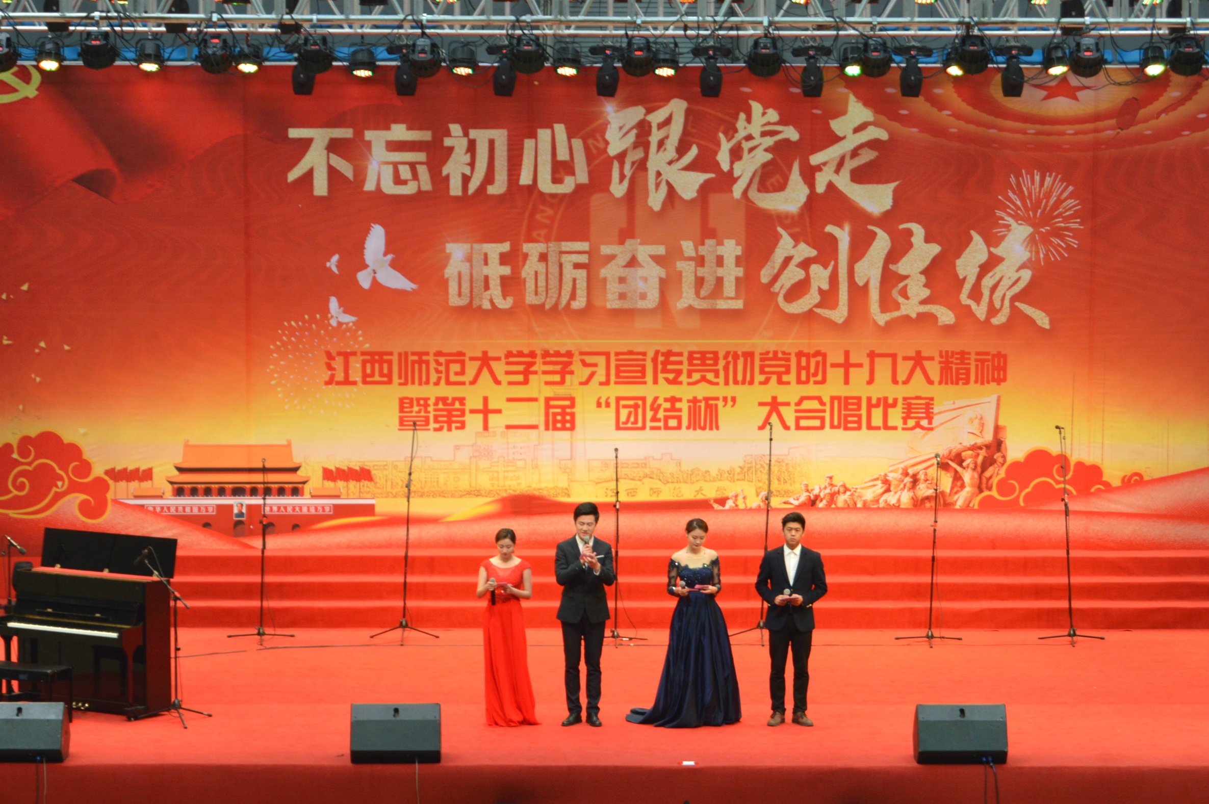 为了进一步推动全校师生学习贯彻党的十九大精神,深刻领会习近平新时代中国特色社会主义思想的深刻内涵。1月5日下午,我校在瑶湖体育场举办了学习宣传贯彻党的十九大精神暨第十二届“团结杯”大合唱比赛。此次大赛,参赛单位共33个,除生命科学学院及其它23个学院,还有图书馆、后勤保障处、老年合唱团、教授合唱团及五个机关部门。