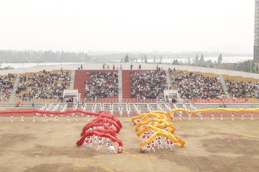 总裁判员和运动员代表进行庄严宣誓后,各学院广播体操比赛正式开始。接着,由21个学院858名学子组成的排舞表演方阵用排舞的方式庆祝百年华诞,展现出对未来远景目标的期待与向往。体育学院的舞龙、武术表演将传统民族体育艺术的魅力展现的淋漓尽致,伴随着欢快的音乐声,同学们卖力的挥舞、快速的奔跑、敏捷的穿梭,代表着喜庆与热闹的红龙和金龙仿佛在他们手中活了过来,全场气氛达到了高潮。