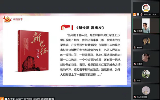 会上,主持人肖越华首先向大家分享学习强国上近期推荐的优秀书单,并邀请预备党员代表分享近期阅读的好书。王海霖同学推荐作家凌翼的《新长征再出发》,并声情并茂地为大家朗读书中的片段:“当年的于都人民,是怎样将中央红军送上万里征程的?如今,依然还有半块门板、被锯走的房梁残端,在岁月深处默默倾诉……”苗鹏璇同学则推荐《金色梦乡》这本书。她表示,透过字里行间,她深深感受到人与人之间的爱与信赖足以抗衡一切苦难,她坚信疫情终会过去、人间唯爱永恒。随后,参会同学分享自己身边的抗“疫”故事。熊文浩同学讲道:“抗疫期间,我看到许多师大师生投身防疫志愿服务工作。他们穿上防护服、带上护具,化身成一位位‘大白’,英勇战疫。他们是我们身边的英雄,平凡却闪闪发光。”