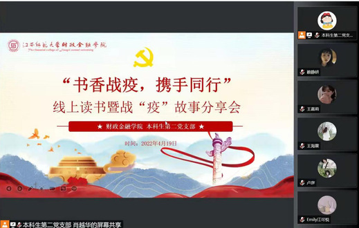 4月23日,财政金融学院本科生第二党支部开展 “书香战疫,携手同行” 线上读书会暨战“疫”故事分享会,支部组织委员肖越华主持会议,支部全体党员参加。
