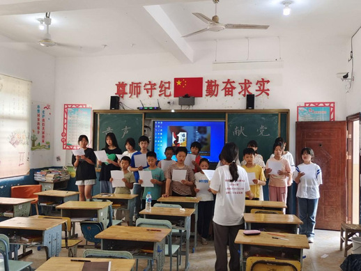图为队员和孩子们一起认真合唱红色歌曲《国家》。(文/图 教育学院 编辑/校团委新媒体运营中心 徐晓艳)