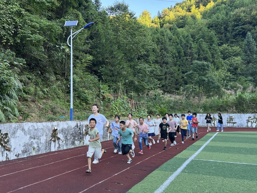 图为实践队队员带领孩子进行跑步锻炼。