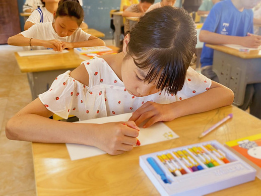 图为孩子在认真地完成献给党101岁生日的蜡笔画。