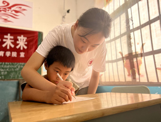 图为实践队队员耐心指导孩子练习硬笔书法,孩子认真聆听。