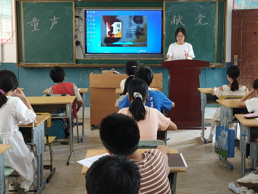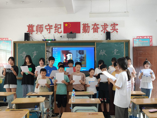 传承文化经典,弘扬国粹魅力。实践队队员蒋子兰、周慧瑶为孩子们带来了一节生动有趣的书法课。课堂上,队员给孩子讲述书法的起源以及五大书体,并进行了基础笔画演示。通过学习基本的书法知识,孩子们写出了一幅幅《七律·长征》的作品。红歌颂党恩,童心永向党。实践队队员还教孩子们唱红色歌曲《国家》。在唱歌前,队员给孩子们介绍《国家》的创作背景并带领孩子们进行练习巩固。在优美的旋律中,队员和孩子们一同重温红色经典,唱响革命旋律。孩子们都心潮澎湃,在歌声中感受到那段激情燃烧的峥嵘岁月。