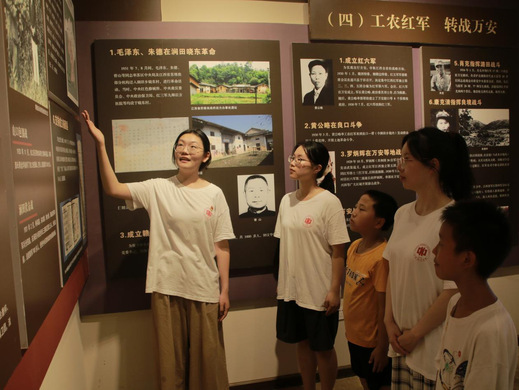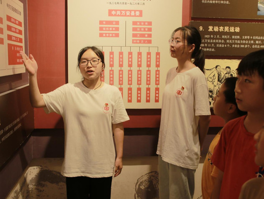 图为汪婷向其他队员和小朋友讲解第一部分“工农运动起高潮”,中共万安县委从正式成立后,经过不断发展,逐渐成为江西最坚强的党组织。