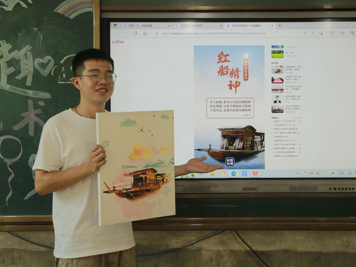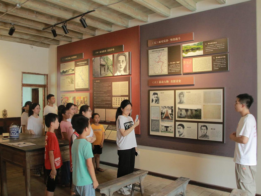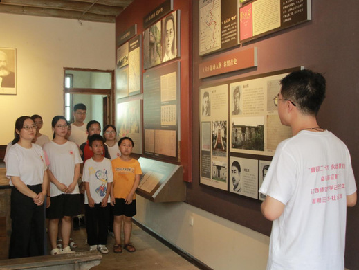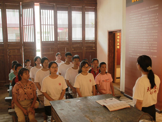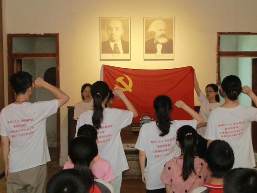 7月1日下午,江西师范大学教育学院赴万安暑期“三下乡”社会实践服务队党员和入党积极分子带领康克清红军小学的小学生们一起走进万安暴动行动委员会旧址,追寻红色足迹、赓续红色血脉。社会实践队指导老师与队员们开展了一堂主题为《红色万安耀千秋 峥嵘岁月映丹青》的微党课,本次微党课以线上线下相结合的方式开展。实践队中的党员对着党旗庄严宣誓,表达对中国共产党的忠诚、为共产主义事业奋斗终身的决心。在旧址另一边的教室里,其余的实践队队员手持红船油画向小朋友们宣讲敢为人先,坚定理想的红船精神。