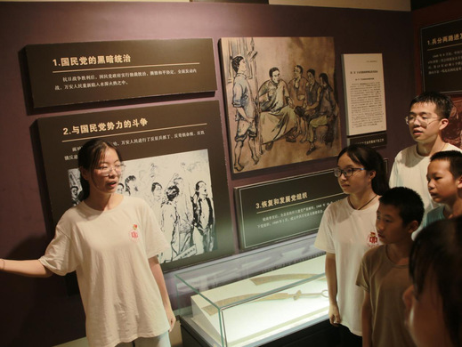 图为缪枋蓉向其他队员和小朋友讲解第四部分“驱寇倒蒋迎解放”。革命征途路漫漫,不破敌寇终不还,1949年8月7日,万安的历史揭开了新的一页。