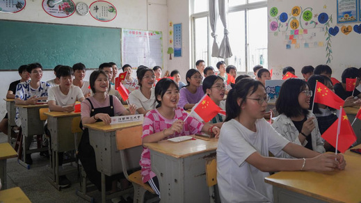 图为信丰县工业园学校毕业生被革命先辈英勇无畏的精神所感染,挥舞国旗,合唱国歌。