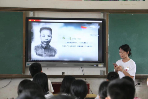 图为实践队队员为信丰县工业园学校学生介绍红色革命家郭一清的革命故事。