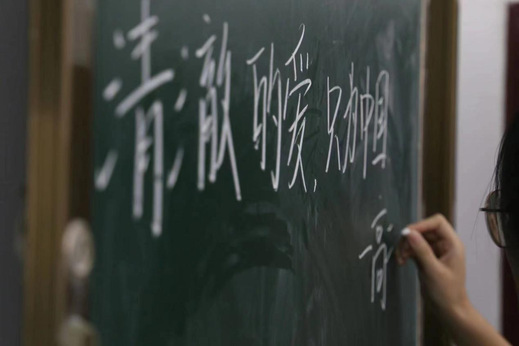 图为信丰八中学生在黑板上郑重写下“清澈的爱,只为中国”的青春誓言。