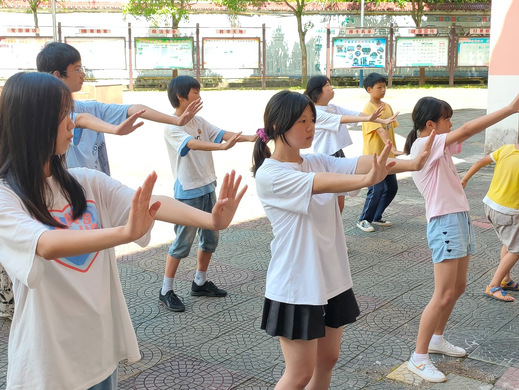 为响应优秀文化进课堂的号召,队员为孩子们准备了太极拳课堂。首先,队员向学生们介绍太极文化与个人身心发展之间的密切联系,并播放了一段轻柔的太极配乐,让学生们放松身心,以便开展太极拳教学。队员郑扬鸣向学生们展示太极拳术的动作与技巧,指导孩子们规范动作。在教学过程中,队员们将游戏与太极基本功相结合,寓教于乐,寓学于趣。