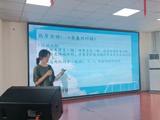 图为何意老师主持热身活动环节,带动课堂氛围。