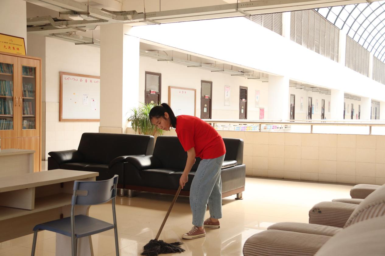在活动负责人详细介绍打扫的注意事项后,同学们听从安排,分工合作,以小组形式前往不同区域进行打扫。他们在明确目标后迅速进入工作状态,实验室里,同学们手拿抹布,仔细擦拭操作台,归类放置实验材料,整齐摆放实验器具。休息区中,同学们观察各处卫生情况,认真清扫,他们不怕苦不怕脏,不放过一片垃圾、一粒灰尘。会议室里,同学们着重清理地面卫生死角,擦净桌面、抽屉、窗台,将桌椅归回原位。很快,在同学们的清扫下,学院各处焕然一新。