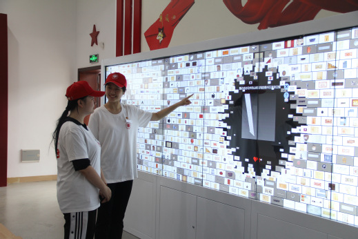 图为实践队员在红色基因库展示大屏面前参观交流。