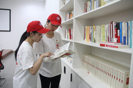 图为实践队员共同阅读井冈山革命根据地史料大全并互相进行交流。