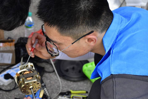图为志愿者检查电器内部电板、电线,对损坏零件进行更换维修。