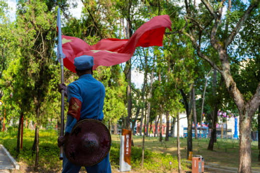 图为老红军后代杨华在“一苏大”旧址挥动中国工农红军大旗的场景。