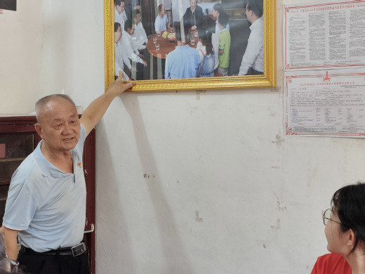 图为孙观发老人为宣讲团成员介绍习近平总书记参观他家时的照片。