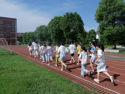 图为志愿者组织同学们在体育课前跑步热身。