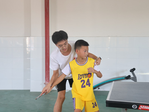 图为志愿者训练同学乒乓球击球姿势。
