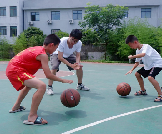 图为志愿者训练同学们打篮球。