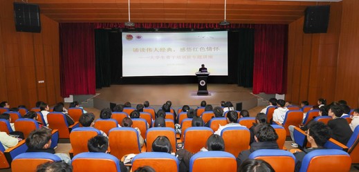 为纪念毛泽东诞辰130周年,12月22日,我校在红色文化教育馆二楼红色影院举行大学生骨干培训班“诵读伟人经典,感悟红色情怀”专题讲座。本次讲座由中国井冈山干部学院副院长、一级巡视员,中国毛泽东诗词研究会副会长汪建新教授主讲,校团委副书记刘亭亭主持,校院两级大学生骨干培训班学员、各学院学生代表参加活动。
