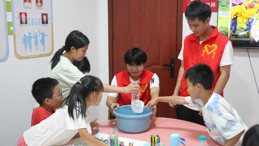 “活动的乒乓球”实验过程中,队员何宇芳借助水瓶使乒乓球悬浮,为小朋友们展示大气压强的“魔力”。“不倒翁”实验中斜立起来的易拉罐、“滴水不漏”实验中仅用一张纸便封住瓶口的塑料瓶,实践队员们引导小朋友们探索实验的奥秘,小朋友们在游戏与体验中开启了一场神秘的科学之旅。实验课堂使得队员们与小朋友们建立情感联系,“破冰行动”顺利进行。