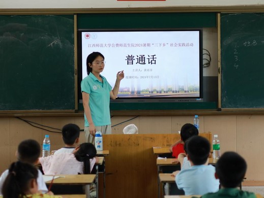 7月13日,江西师范大学公费师范生院2024暑期“一程山水传乡韵,一路推普助振兴”实践队在上饶市广信区黄市中心小学开展了普通话教学。